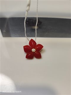 18K黄金钻石镶天然阿卡牛血红珊瑚花朵吊坠