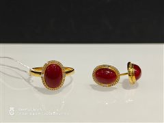 18K黄金钻石镶天然阿卡深牛血红珊瑚蛋面戒指/耳钉套装