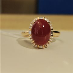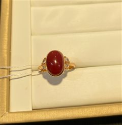 18K黄金钻石镶天然阿卡深牛血红珊瑚蛋面戒指