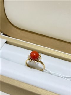 18K黄金钻石镶天然阿卡牛血红珊瑚蛋面戒指