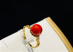 18K彩金钻石镶天然阿卡牛血红珊瑚圆珠戒指(9.5mm)