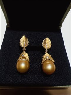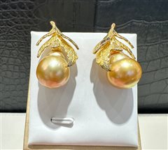 纯银镶嵌天然海水南洋金珍珠耳坠(13-14mm)