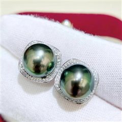 18K白金钻石镶天然海水大溪地珍珠耳钉(11-12mm)